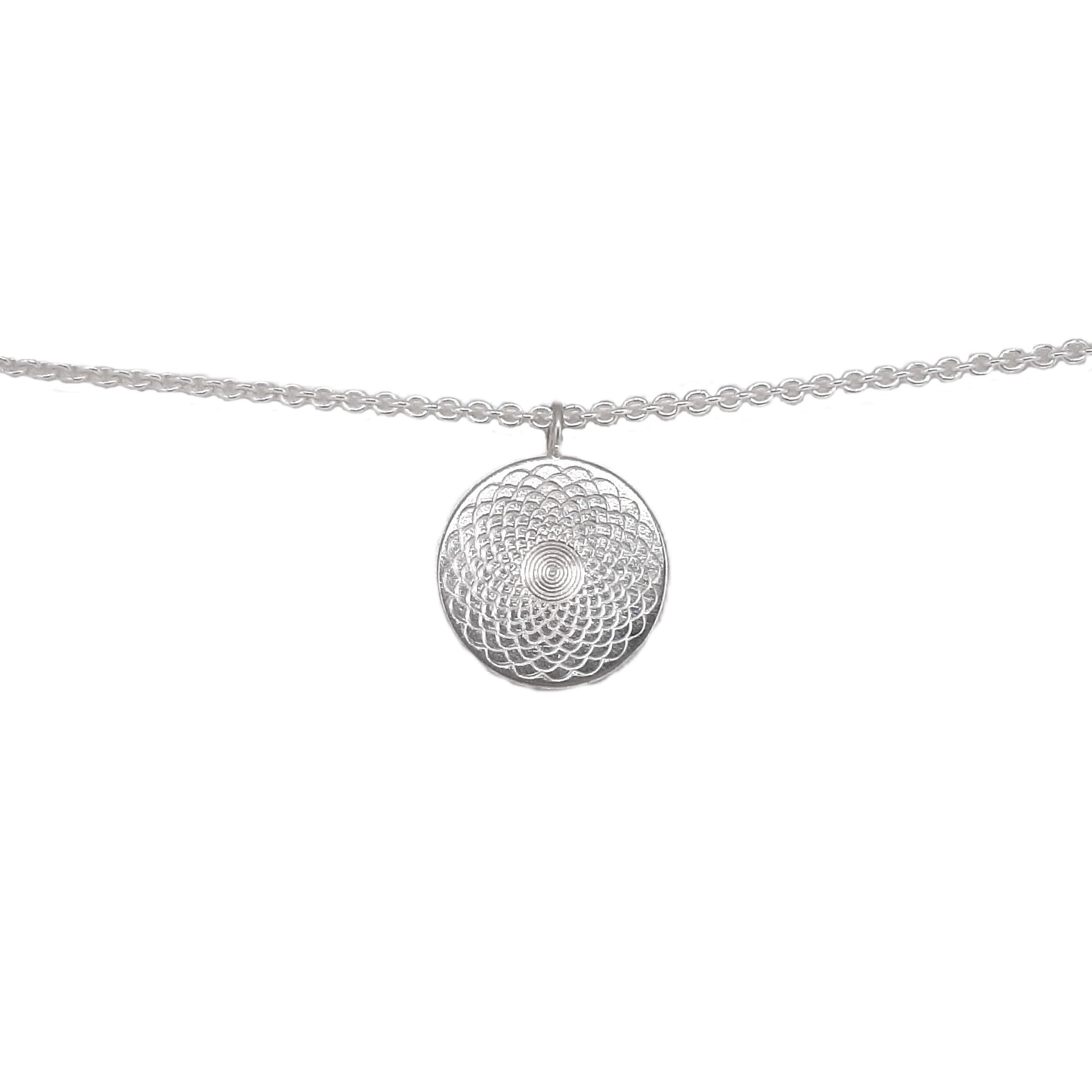 An elegant example of a barleycorn pattern created on the Rose Engine displayed on a 20mm stirling silver disc. Available on a 16in, 18in or 20in chain.