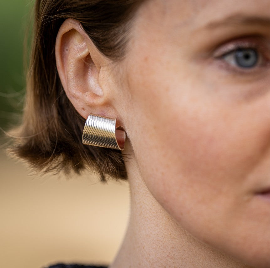A fluid expression of light and movement, these Sterling Silver Semi Hoop Earrings feature the timeless artistry of a Wave Guilloché pattern—a precise, hand-engraved pattern.