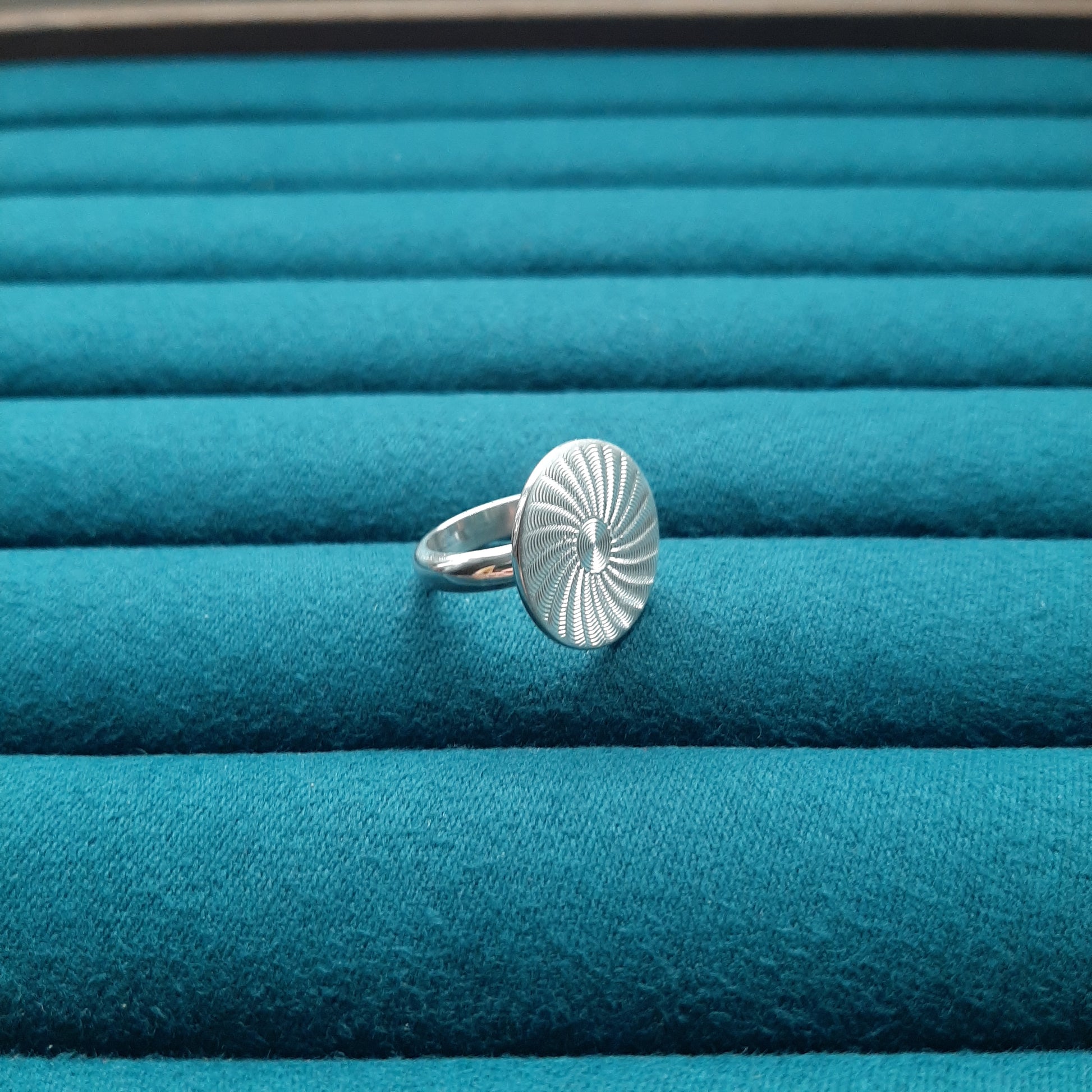 An elegant example of a swirl pattern created on the Rose Engine displayed on a 20mm stirling silver disc.